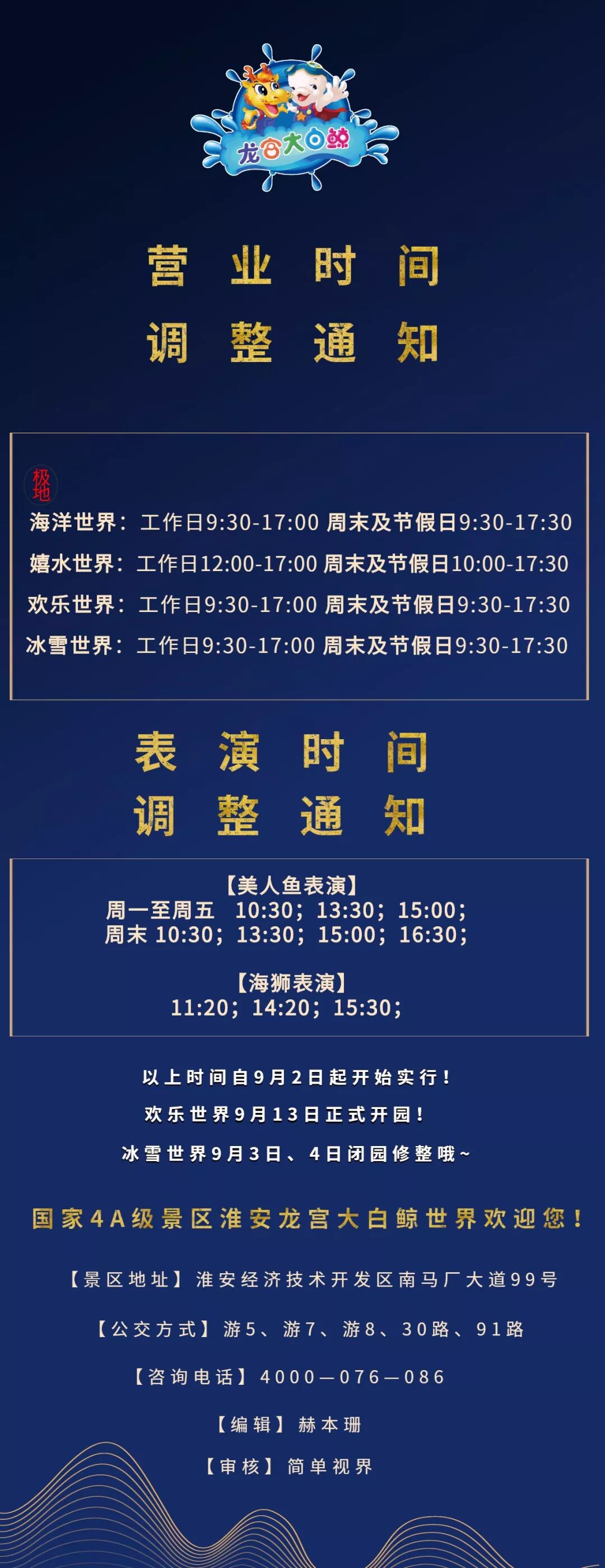 【通知】自9月2日起,龙宫大白鲸营业和表演时间调整!